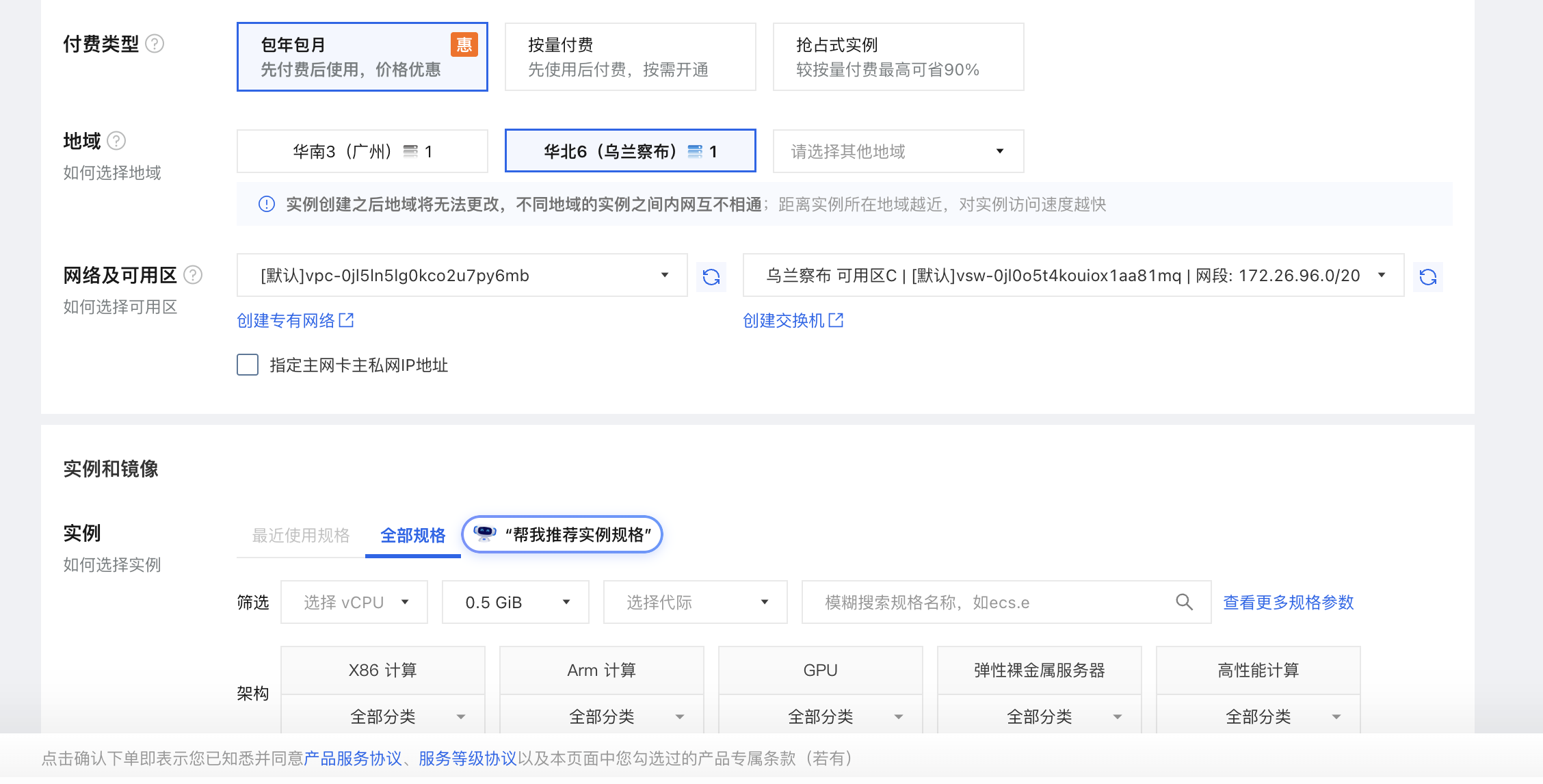 购买esc服务器 地址 -付费类型(包年包月)-地区(乌兰察布)-实例规格筛选(0.5g内存一般最低价格)