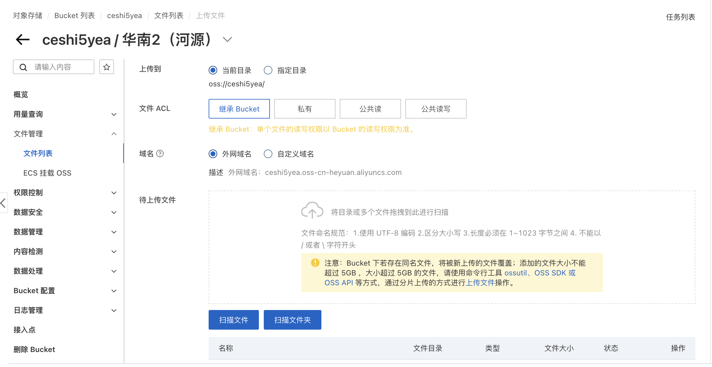 创建后进入bucket-选择上传文件(文件下载地址)