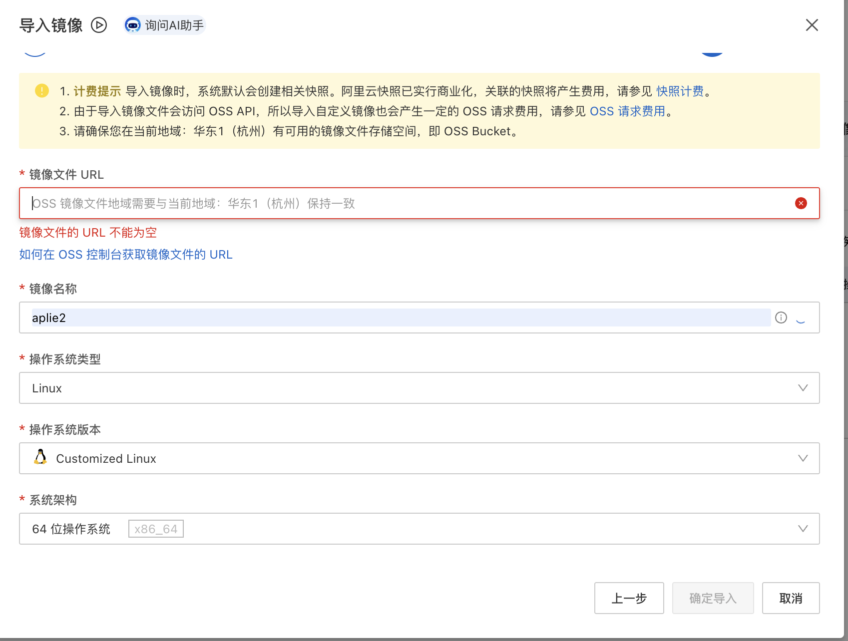 把刚才复制的链接填入到(镜像文件url)-系统Linux-操作版本customized Linux-系统架构64位